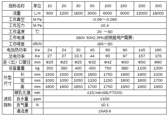 潤滑油專用真空濾油機(jī)參數(shù):
