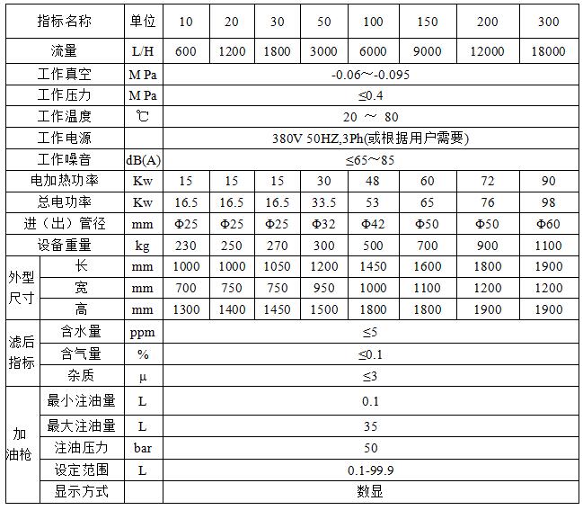 同時(shí)可用于對(duì)電氣設(shè)備抽真空、真空注油、加油、過(guò)濾等。使用時(shí)先用真空泵將電氣設(shè)備上面的金屬膨脹器上部抽到高真空后,絕緣油可以通過(guò)油管下部自動(dòng)注油或通過(guò)油泵注油到設(shè)備所屬的正常油位。保證充油設(shè)備內(nèi)的殘余氣體特別是線圈間的氣體首先被抽掉,設(shè)備注油、補(bǔ)油更方便安全,油質(zhì)不污染,能保證設(shè)備原有絕緣性能。也是各電廠、電站、變電所、電器制造廠、工礦企業(yè)過(guò)濾變壓器油、透平油、機(jī)油、液壓油等油液中的少量水份、氣體和雜質(zhì)的理想設(shè)備。
